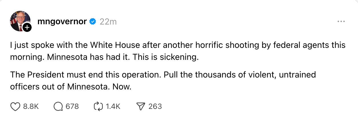 Governor Tim Walz wrote, “Minnesota has had it. This is sickening. The President must end this operation. Pull the thousands of violent, untrained officers out of Minnesota.”