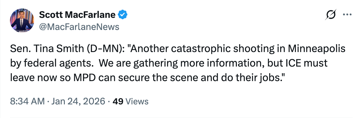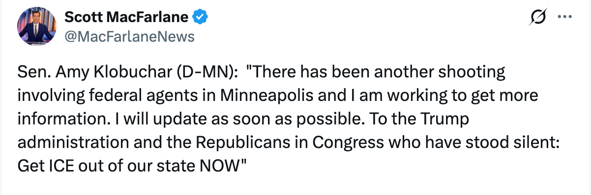Senator Amy Klobuchar said, “There has been another shooting involving federal agents in Minneapolis and I am working to get more information. I will update as soon as possible. To the Trump administration and the Republicans in Congress who have stood silent: Get ICE out of our state NOW.”