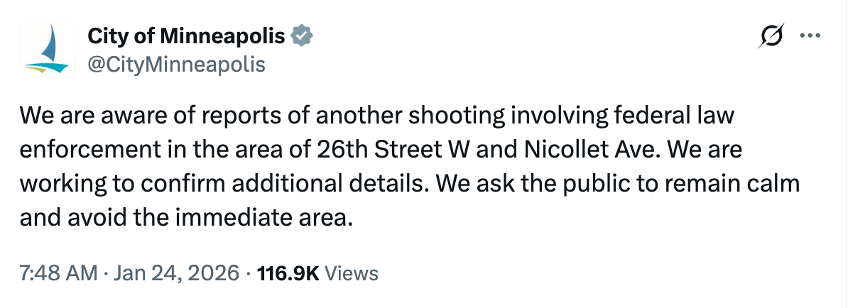 The City of Minneapolis posted a statement on Twitter saying it is aware of the shooting and is actively working to confirm additional details. City officials urged the public to remain calm and avoid the area while the situation is investigated and secured.