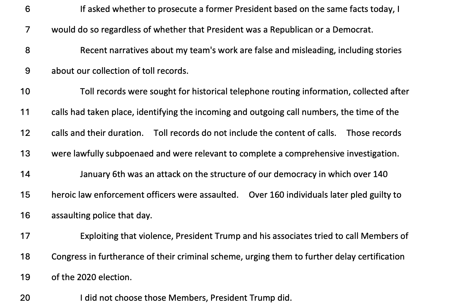 Smith also pushed back against allegations surrounding his office’s collection of toll records, emphasizing that such records contained only noncontent information, including phone numbers, call times, and durations, and did not include the substance of any conversations. He said the records were lawfully subpoenaed and necessary to complete a comprehensive investigation.