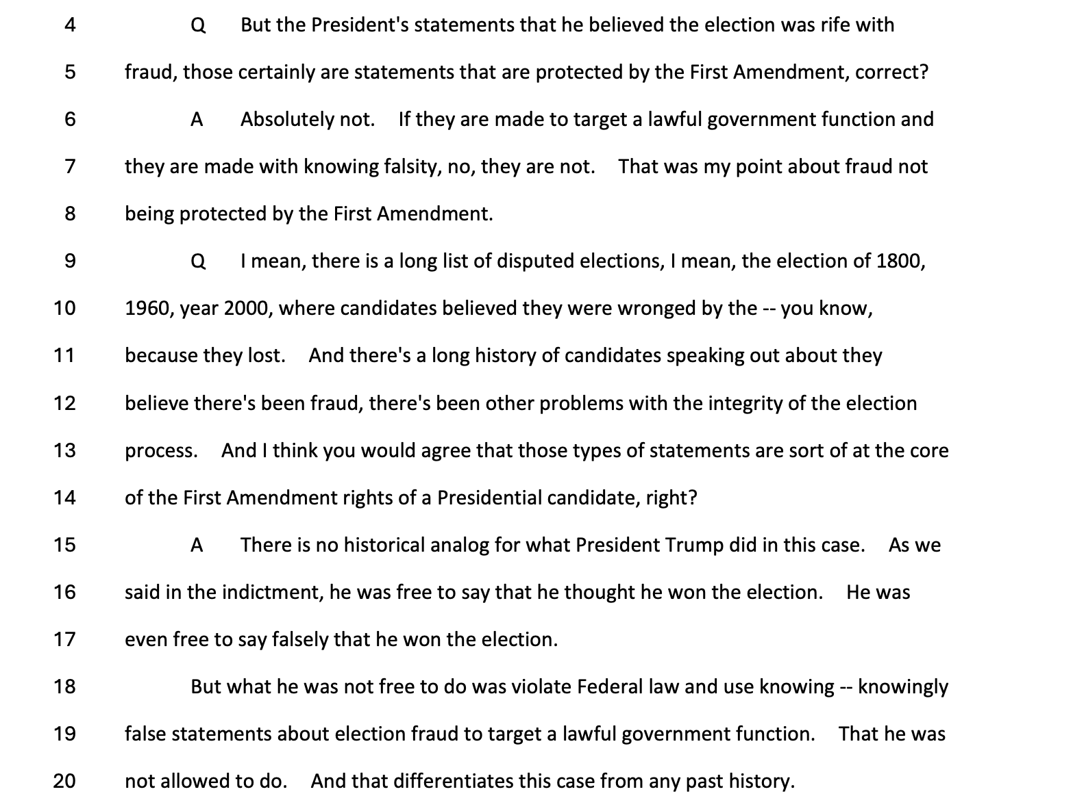 A central exchange during questioning focused on whether Trump’s false election fraud claims were protected by the First Amendment. Smith flatly rejected that characterization.