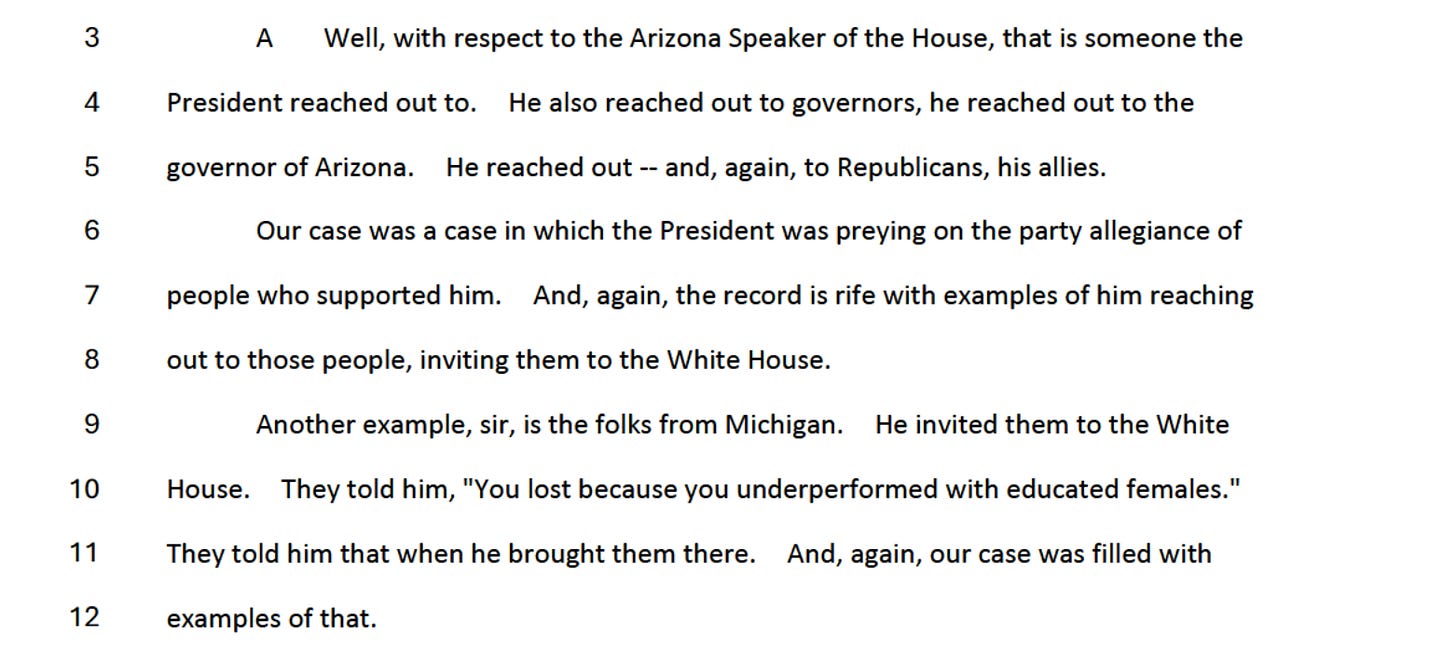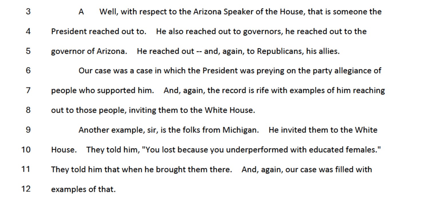 “We had numerous witnesses who would say, ‘I voted for President Trump. I campaigned for President Trump. I wanted him to win,’” Smith testified, citing Republican legislative leaders in Arizona and Michigan and a Pennsylvania elector who described the scheme as illegal and an attempt to overthrow the government.