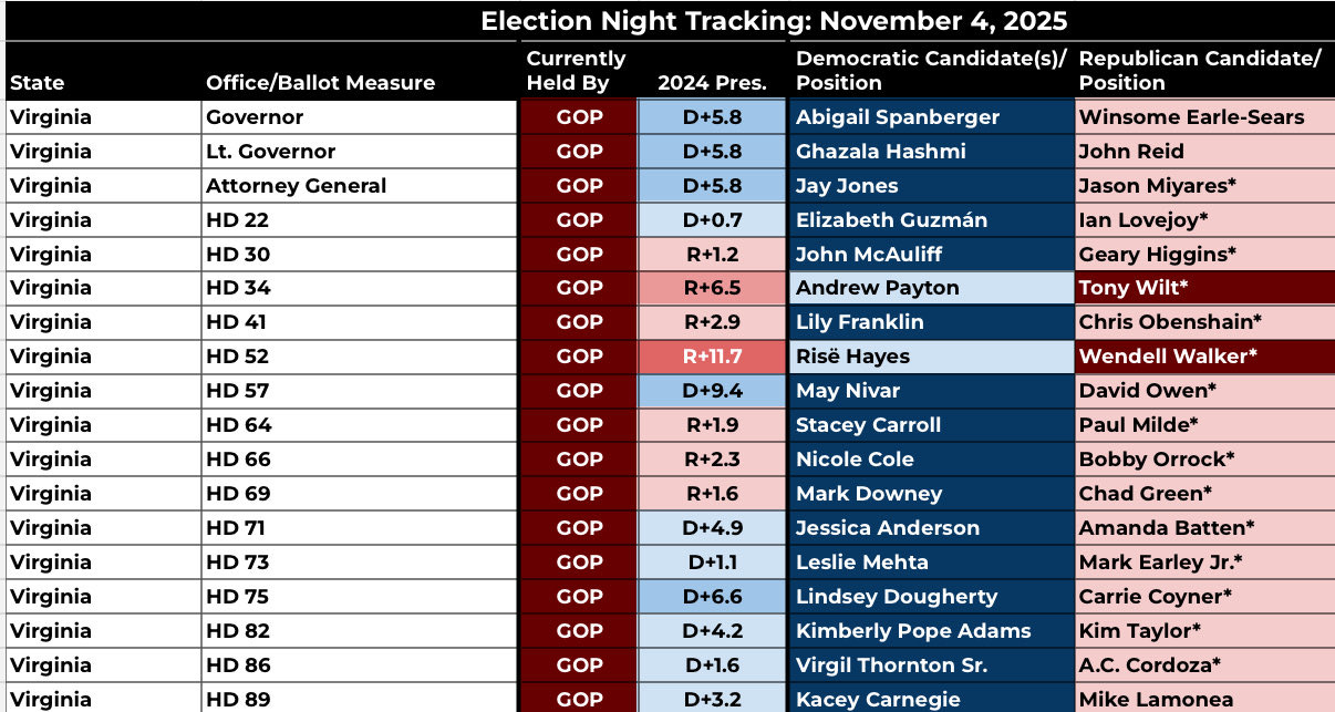 The Democratic wave extended deep into state and local races. Virginia’s legislature turned solidly blue following a series of significant flips, ensuring unified Democratic control in the state for the first time in years.