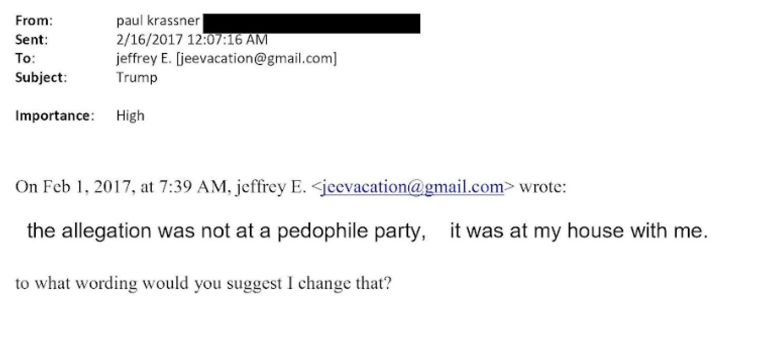Another email from a “Paul Krassner” to Jeffrey Epstein with the subject line “Trump” discussed a “pedophile party.”