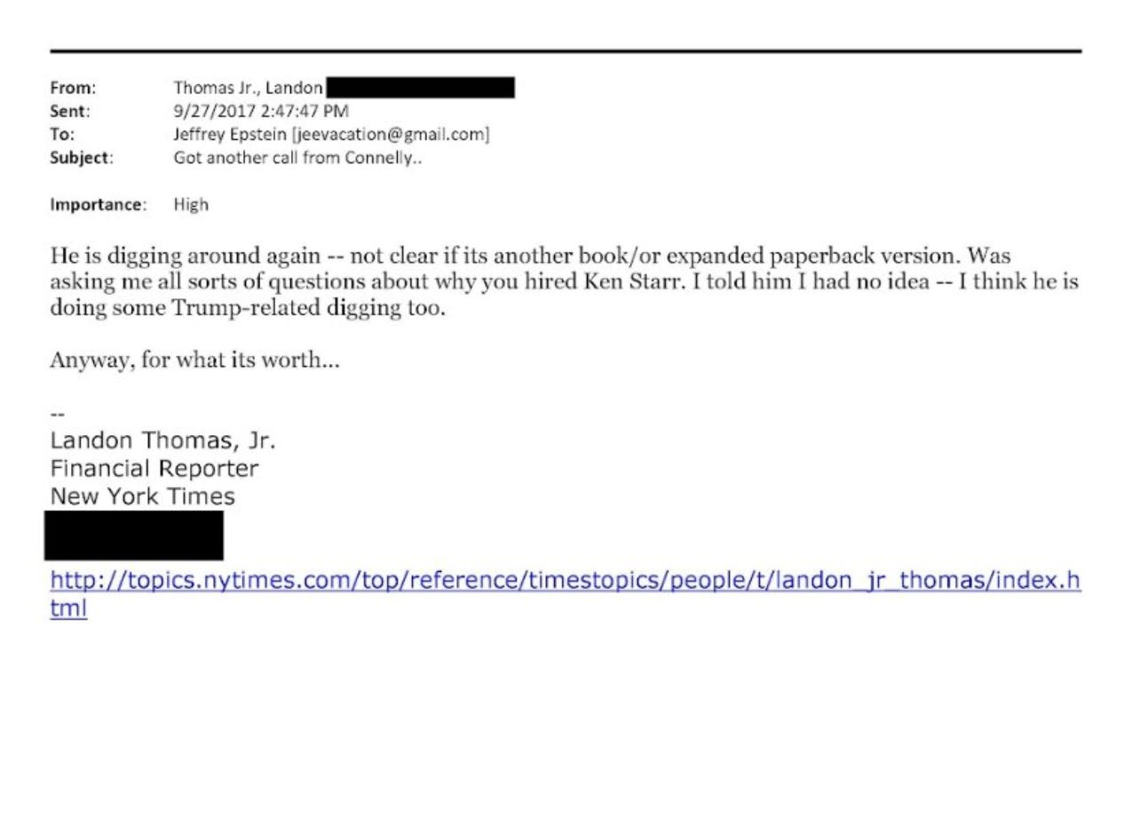 Another email shows then–New York Times journalist Landon Thomas alerting Epstein to follow-up reporting by journalist and former NYPD detective John Connolly. Reporters talk to sources, including unsavory ones—that’s not new. What’s new is the apparent direction of travel: a heads-up to Epstein about another journalist’s work. At minimum, it demands clarity: was this routine source management, a misguided attempt to curry favor, or something deeper? Transparency from the outlets involved is both necessary and overdue.