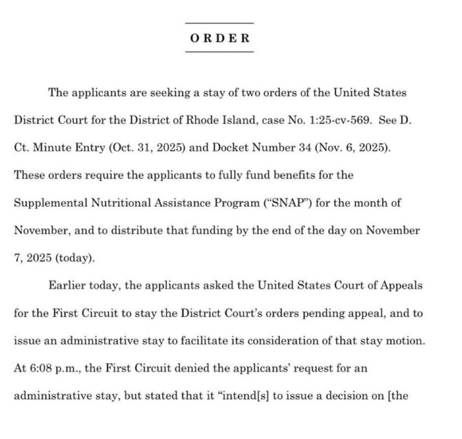 Apologies for another email on a Friday night, but, the Supreme Court tonight temporarily froze a federal district judge’s order requiring the Trump administration to deliver full SNAP benefits to roughly 42 million Americans by the end of the day. The ruling landed just hours after a federal appeals court in Boston rejected the administration’s attempt to halt the mandate, briefly setting the stage for an urgent race to restore food assistance for one in eight Americans.