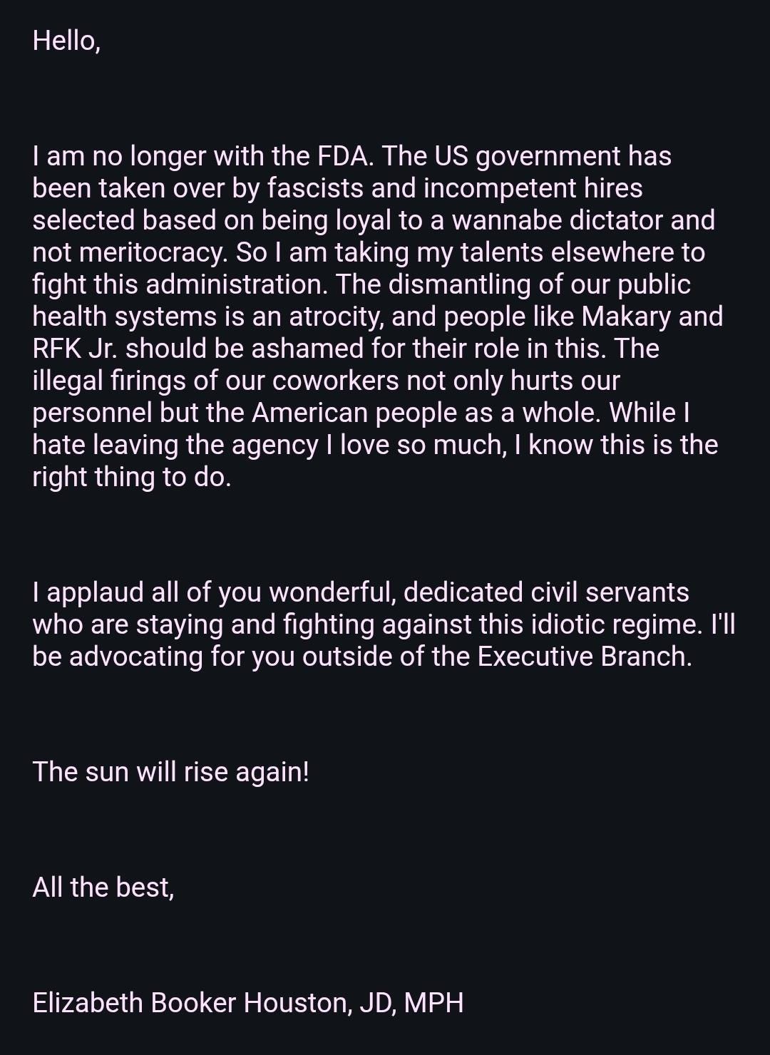 This afternoon, I bring you an exclusive interview you won’t want to miss. Elizabeth Booker Houston, a government information specialist with deep expertise in privacy law at the FDA, has just stepped down after years of service—and she’s speaking out for the first time. Throughout the second Trump administration, Houston remained in place not out of loyalty, but out of necessity: she was one of the only officials safeguarding Americans' privacy rights inside the FDA. No one else could do her job. And so, despite internal resistance, political pressure, and personal cost, she stayed and fought.