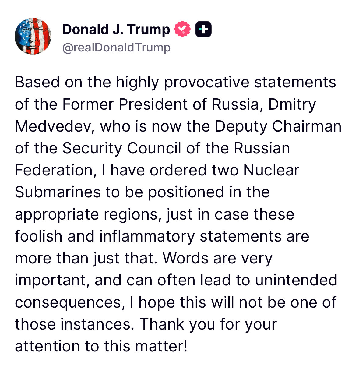We have breaking news right now. Donald Trump has ordered the deployment of multiple nuclear submarines near Russia in response to recent statements by a top Russian government official.
