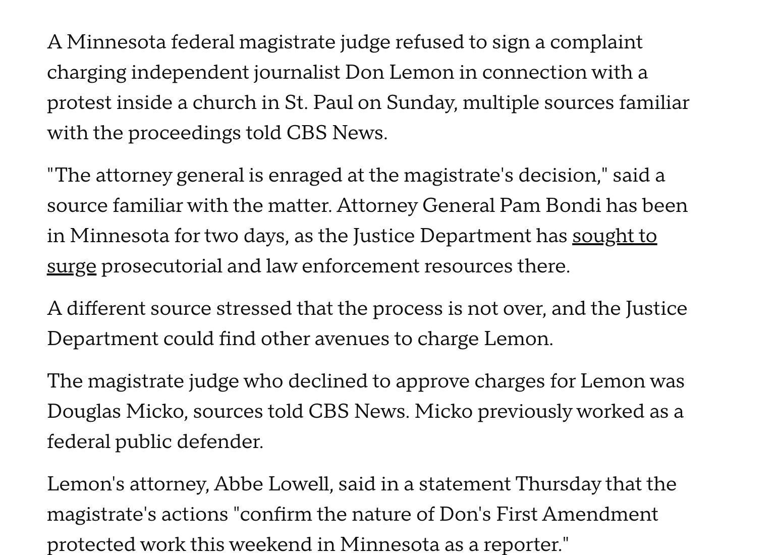 The precise charges against Lemon were still unclear at the time of his arrest. What is clear is the extraordinary path the Trump Justice Department took to get there. Just days earlier, a magistrate judge refused to sign a criminal complaint against Lemon, finding the evidence insufficient.