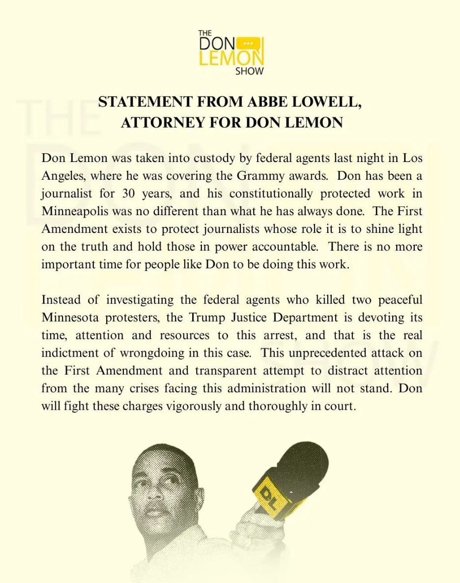 Good morning everyone. This was not the update I expected to give you this morning, but federal authorities arrested former CNN anchor Don Lemon late Thursday in what amounts to an unmistakable act of overreach—one that directly threatens the First Amendment and signals a dangerous escalation in the Trump administration’s campaign against dissent and press freedom.