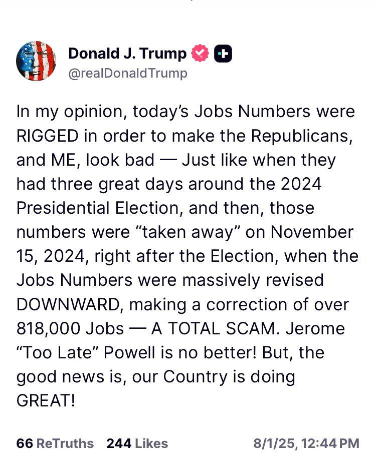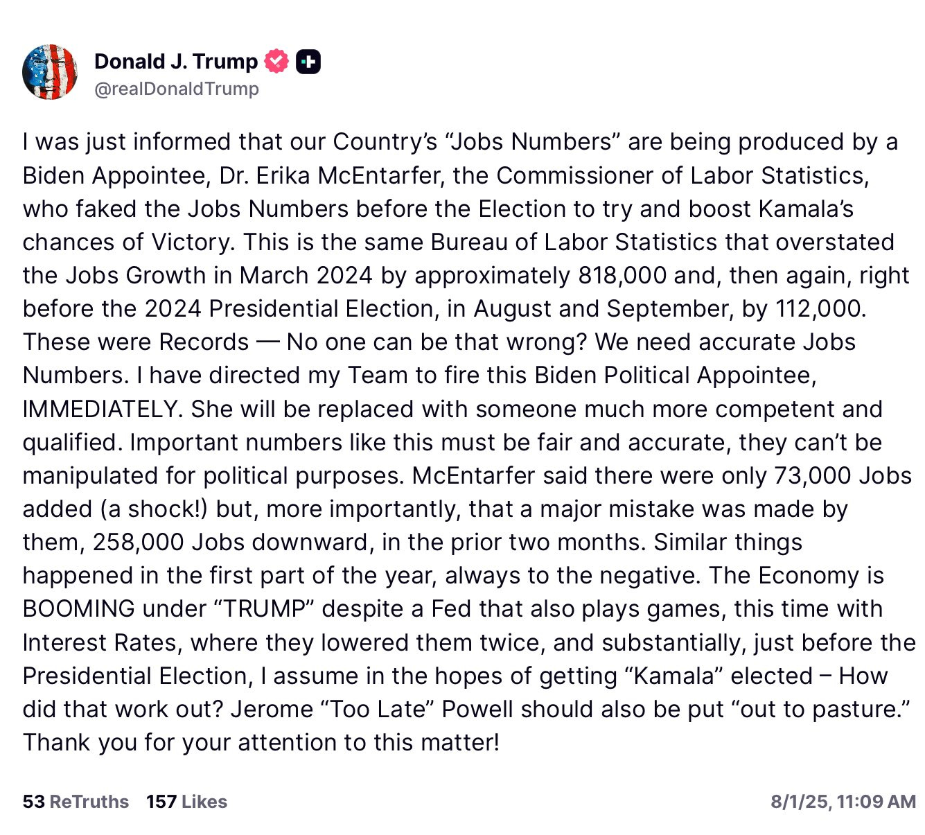 In a Truth Social post, Donald Trump accused, without evidence, her of faking employment figures before last year’s election to help Kamala Harris, and manipulating current numbers for political reasons. He announced her immediate firing, calling her a “Biden Political Appointee” and stating she would be replaced with someone “more competent and qualified,” adding that “important numbers like this must be fair and accurate, they can’t be manipulated for political purposes.”