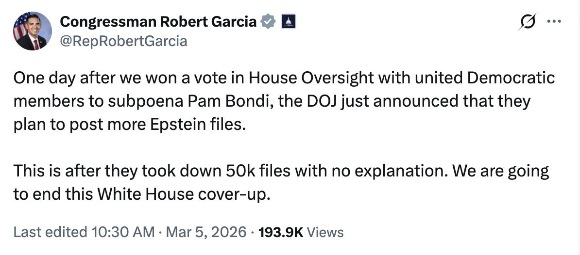 Garcia said approximately 50,000 Epstein-related files had previously been removed without explanation.