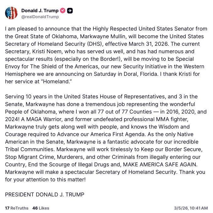 We have breaking news right now. President Donald Trump has removed Homeland Security Secretary Kristi Noem and announced Senator Markwayne Mullin as her replacement, with the change expected to take effect on March 31. I am working around the clock to get you updates in real time. Subscribe to support my work and this independent journalism. Your support fuels this work.