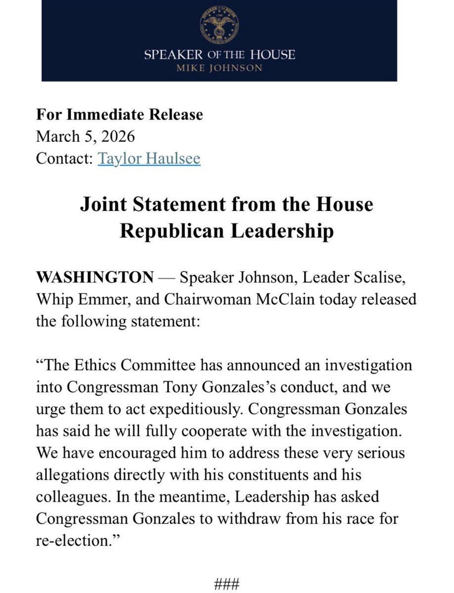 House Speaker Mike Johnson, Majority Leader Steve Scalise, Majority Whip Tom Emmer, and Conference Chairwoman Lisa McClain released a joint statement publicly calling on Gonzales to step aside from the race.