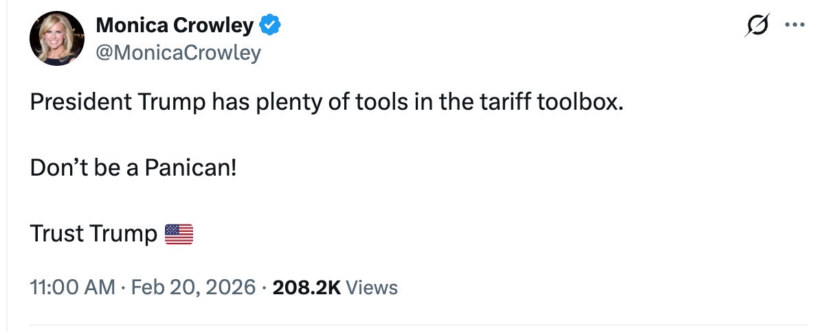 Trump allies have attempted to project confidence. U.S. Chief of Protocol Monica Crowley reassured supporters on social media that the president still has “plenty of tools in the tariff toolbox” and urged them not to panic.