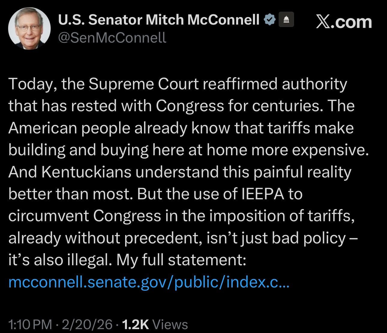Yet the Republican response has not been unified. Senator Mitch McConnell welcomed the ruling, describing it as a reaffirmation of congressional authority that has rested with Congress for centuries.