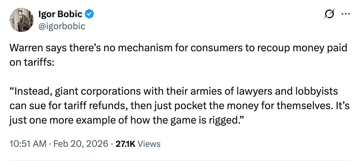 For American consumers, however, the outcome is more complicated. Senator Elizabeth Warren warned that there is no clear mechanism for individuals to recover higher prices paid as a result of the tariffs.