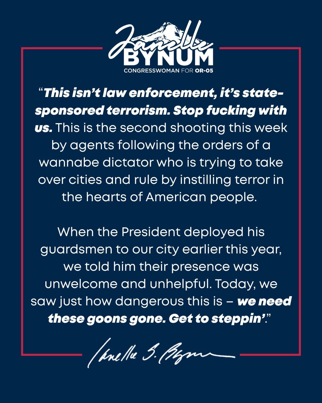 Oregon Congresswoman Janelle Bynum released a statement saying “Don’t fuck with us.”