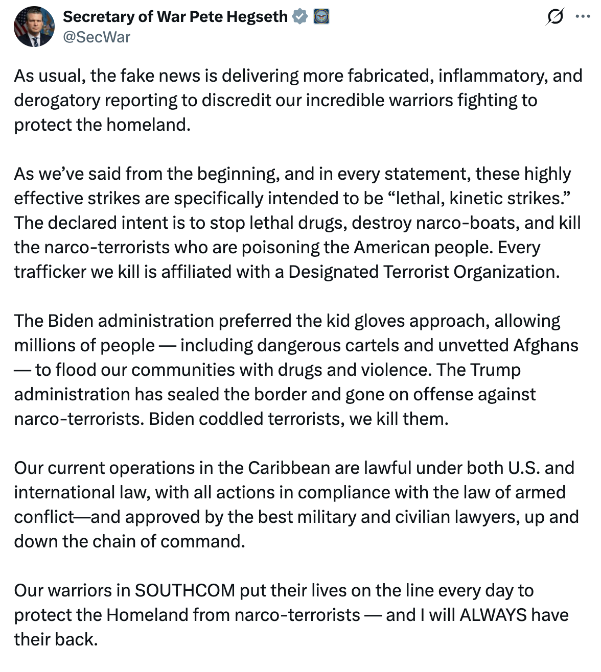 The Washington Post had reported that Hegseth issued an extraordinary instruction: a follow-on strike allegedly intended to kill survivors of a destroyed vessel suspected of narcotics trafficking. Hegseth has denounced the article as “fabricated, inflammatory, and derogatory.” But now, the White House is confirming the reporting.