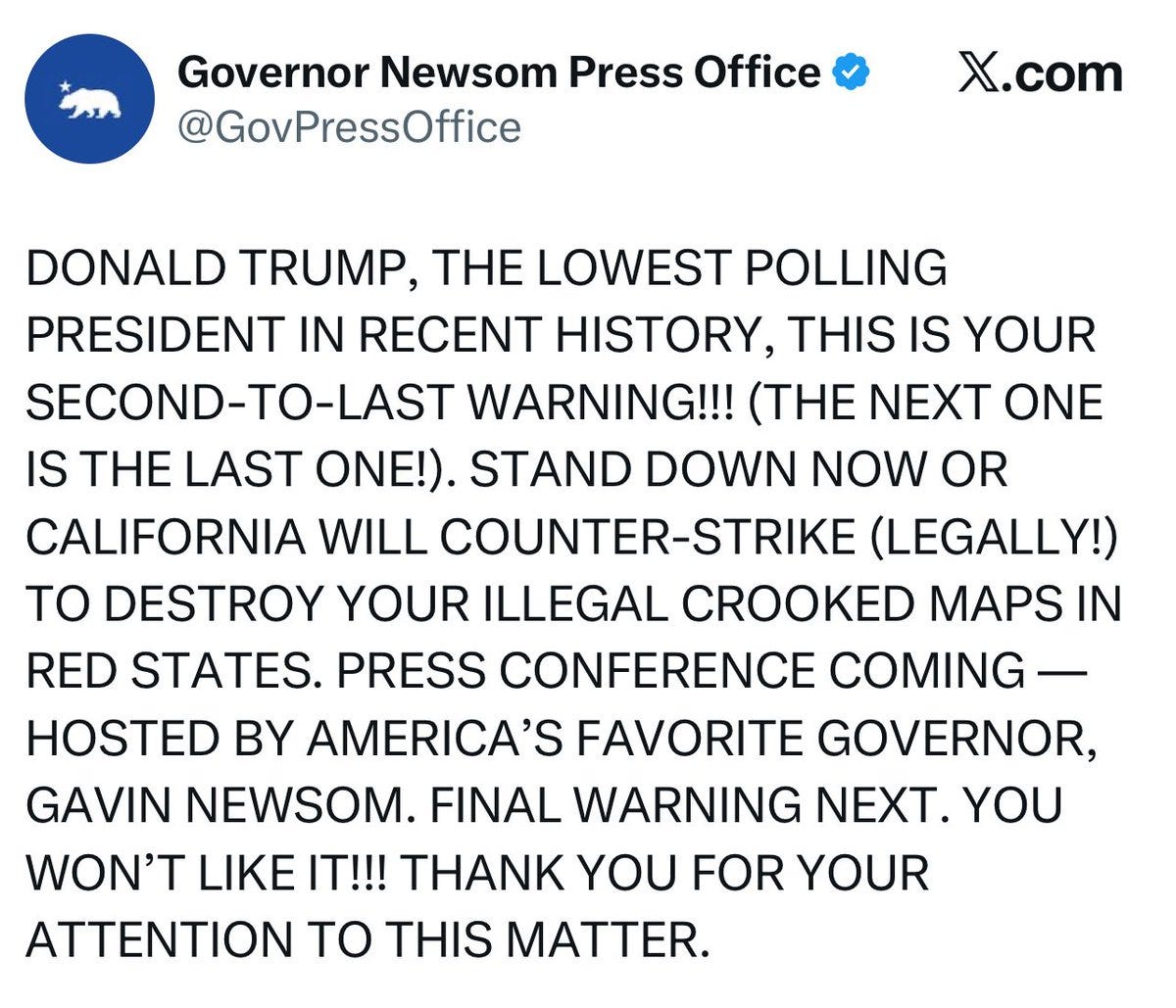 California Gov. Gavin Newsom issued a stark warning to President Trump today about redistricting efforts: