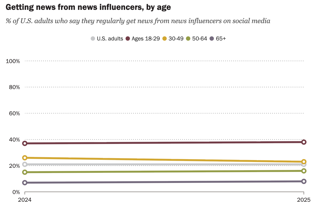 About one in five U.S. adults, or 21 percent, say they regularly get news from news influencers on social media. This is unchanged from when the question was first asked in 2024. The survey defined news influencers as individuals with large followings online who frequently post about news, politics, or social issues.