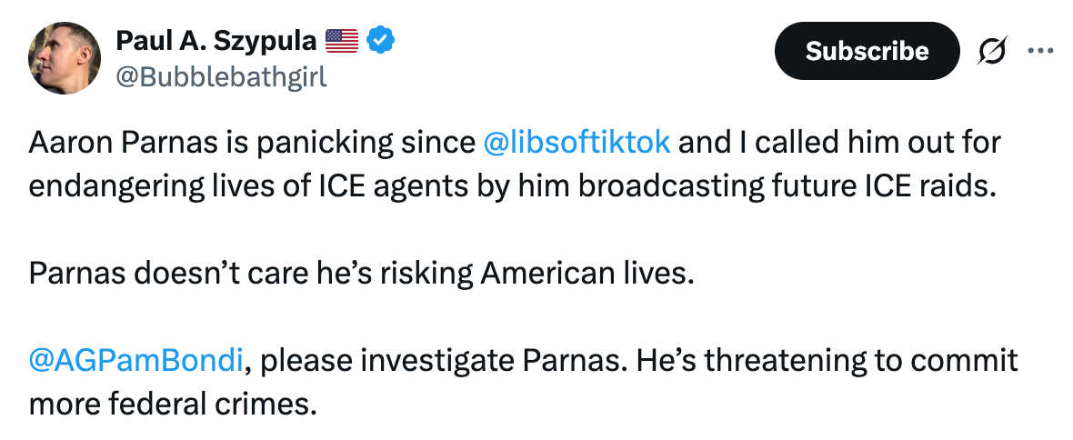 “Aaron Parnas is panicking since @libsoftiktok and I called him out for endangering lives of ICE agents by him broadcasting future ICE raids. Parnas doesn’t care he’s risking American lives. @AGPamBondi, please investigate Parnas. He’s threatening to commit more federal crimes.”