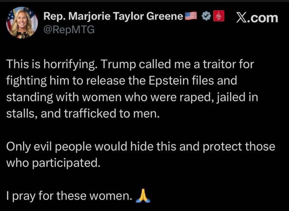 At the same time, Rep. Marjorie Taylor Greene, who previously opposed broader transparency around the Epstein files, is now condemning efforts to keep portions of the records sealed, calling those responsible “evil.”