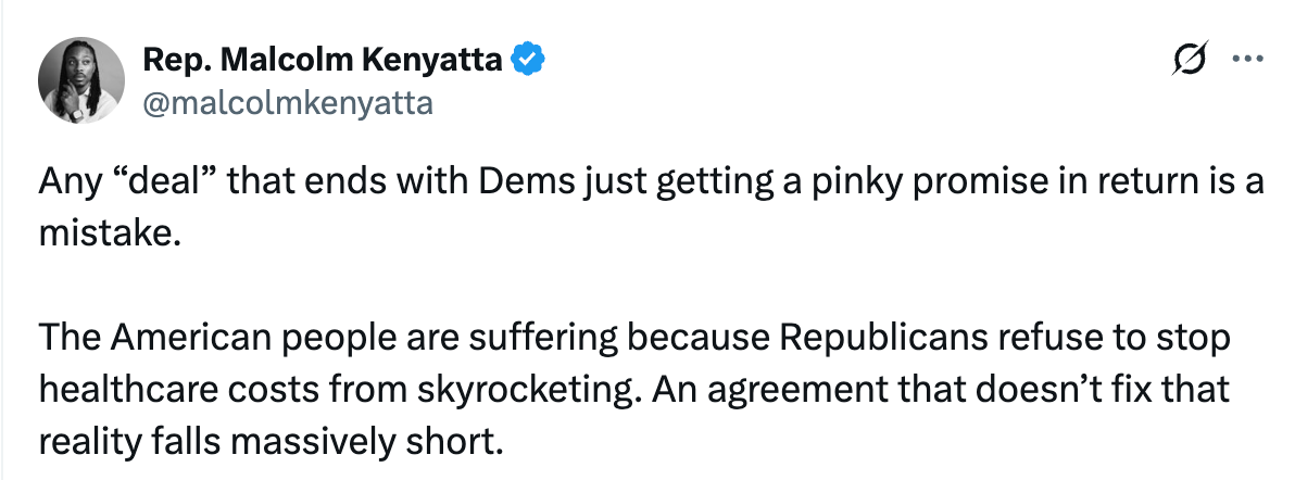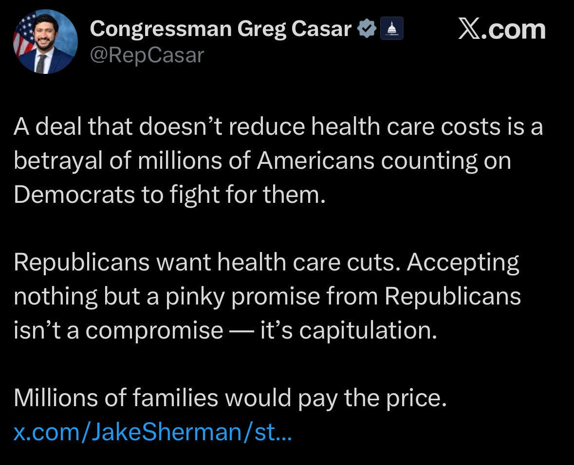 Progressives responded even more forcefully. Representative Greg Casar blasted Senate Democrats willing to support the bill, accusing them of abandoning leverage and accepting a deal that does not reflect Democratic priorities.