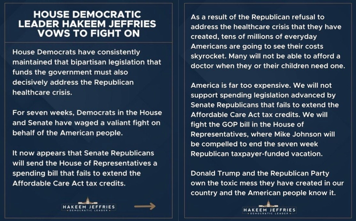 House Democratic Leader Hakeem Jeffries acknowledged that the Senate is expected to pass the bill. Yet he made sure to distance House Democrats from the compromise, issuing a statement firmly opposing the continuing resolution. His message was unmistakable: Senate Democrats may choose one path, but House Democrats do not endorse this approach and will not provide political cover for those who do.