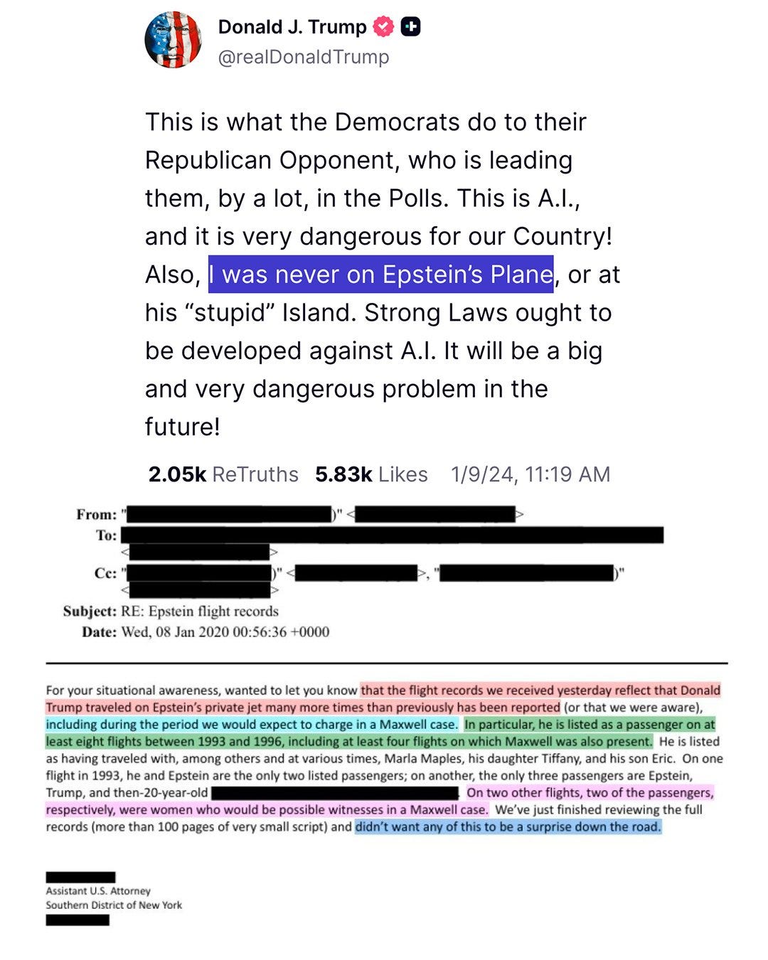 A newly surfaced Truth Social from 2024 shows Donald Trump claiming he was “never” on Epstein’s plane. Today we learned that the Justice Department had documents showing that Trump was not just on Epstein’s plane, but that they were surprised he was on Epstein’s plane as often as he was: