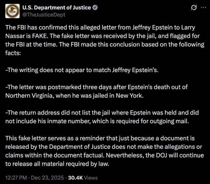 The Justice Department said, after a two hour long investigation, that a purported note signed by Jeffrey Epstein and addressed to Larry Nassar was fake after review, noting the writing did not match Epstein’s and warning that documents released by the Justice Department are not inherently factual, despite the letter’s shocking content and a postmark dated days after Epstein’s death via the USPS.