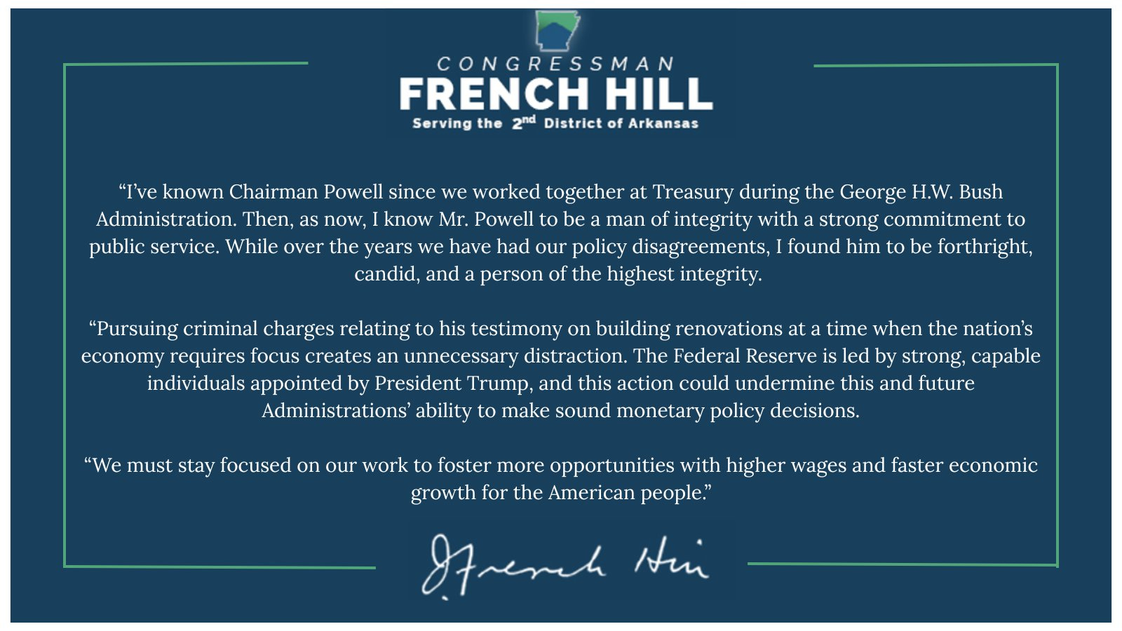 Republican Rep. French Hill, chair of the House Financial Services Committee, defended Federal Reserve Chair Jerome Powell as “a person of the highest integrity,” warning that any criminal pursuit against him is an unnecessary distraction that could undermine central bank independence and weaken the government’s ability to conduct sound monetary policy and support economic growth.
