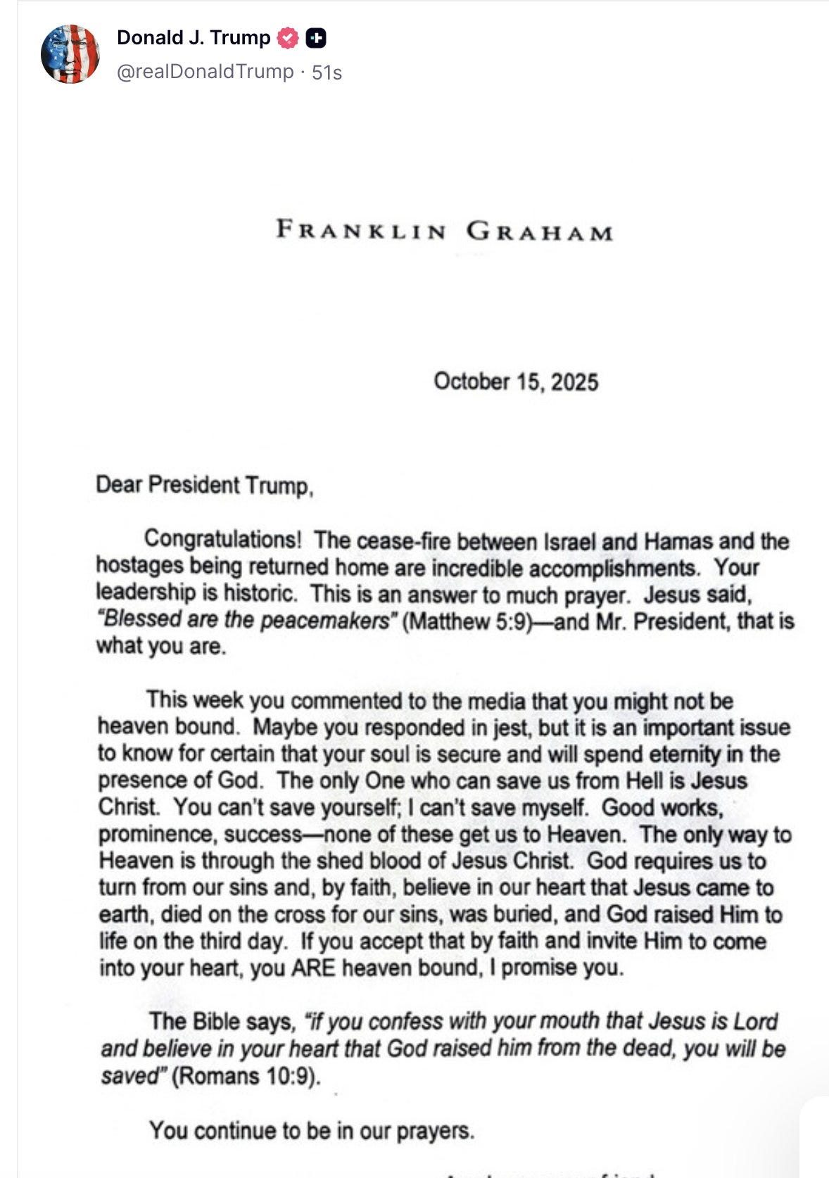 In response, Trump posted a letter that Franklin Graham wrote to Trump expressing concern about comments suggesting he might not be “heaven bound,” emphasizing that salvation is a serious matter and encouraging certainty about one’s eternal fate. The message frames spiritual assurance as essential, urging reflection on faith and the afterlife.