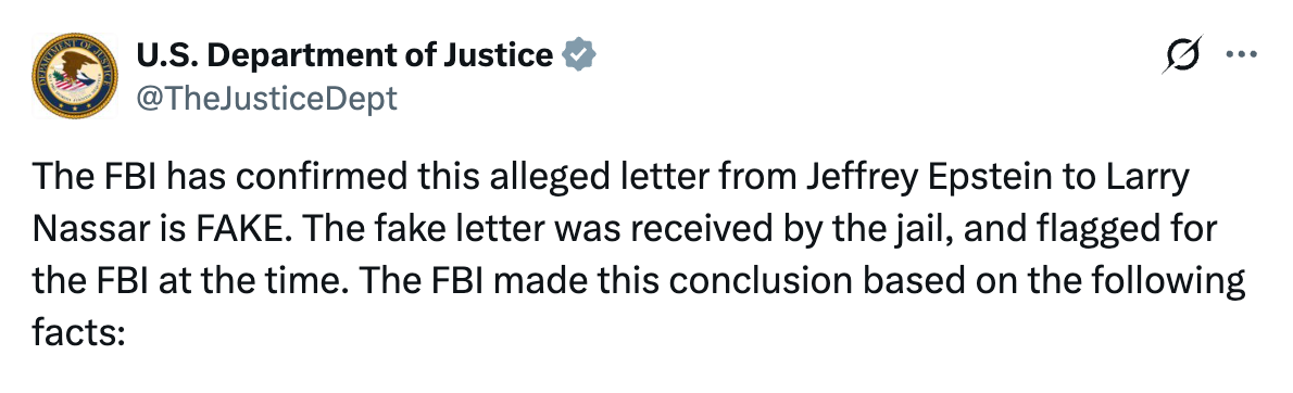 We saw this play out with the purported Epstein-Nassar letter. The document was released without explanation. The public reacted. Hours later, the Justice Department stated it was fake. Even assuming that explanation is accurate, critical questions remain. We know a handwriting analysis was ordered. The results have not been released.