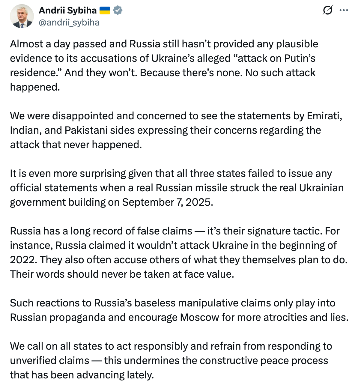 Ukraine rejected Russia’s claim that Ukrainian forces carried out a drone attack on President Vladimir Putin’s state residence, saying Moscow has provided no evidence to support the allegation. Ukrainian Foreign Minister Andrii Sybiha said the claim is a familiar Russian tactic meant to justify future attacks and undermine peace talks, accusing Russia of projecting its own intentions onto others.