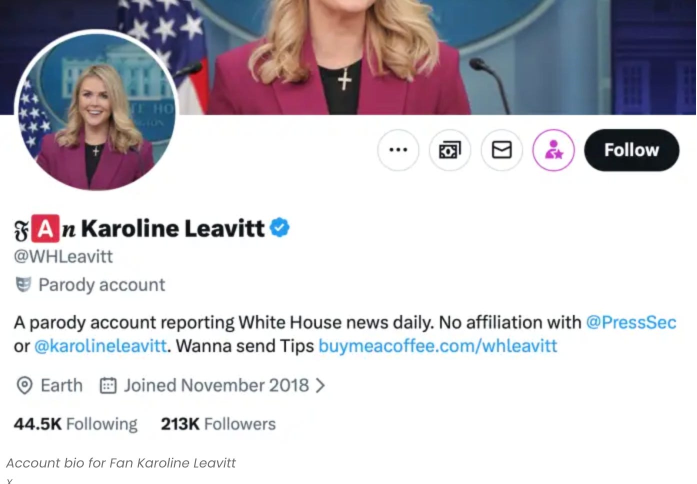 Trump amplified posts from a fake social media account impersonating White House press secretary Karoline Leavitt, including election-denial and anti-immigrant content, despite the account being flagged as a parody and traced to Taiwan.
