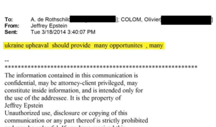 On the day Vladimir Putin announced Russia’s annexation of Crimea, Jeffrey Epstein emailed Ariane de Rothschild suggesting the Ukraine crisis could create “many opportunities,” implying he saw geopolitical instability as a chance for financial, strategic, or influence-seeking gain rather than commenting on humanitarian or political consequences.