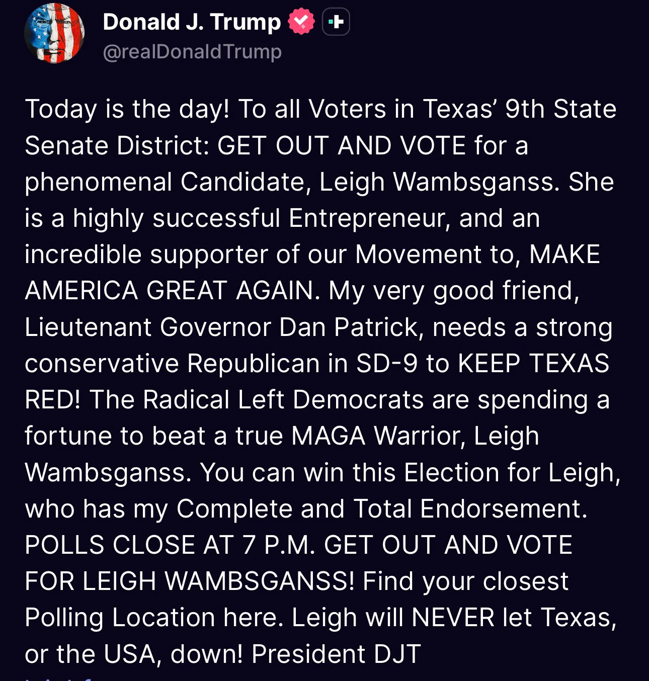 Donald Trump downplayed Democrats flipping a Texas state Senate seat he had previously won by 17 points, distancing himself from the loss despite endorsing the Republican candidate, while saying he expects to make an endorsement soon in Texas’ competitive U.S. Senate race. Here is him endorsing the candidate: