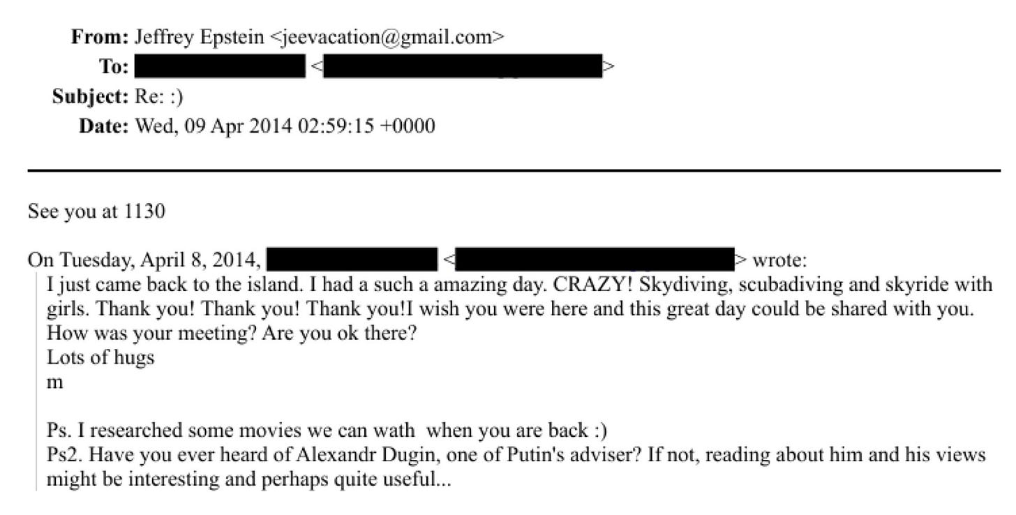 In 2014, a correspondent advised Jeffrey Epstein to read up on “Alexandr Dugin, Putin’s adviser,” suggesting the material might be “interesting and perhaps quite useful,” pointing to Epstein’s interest in figures tied to Vladimir Putin and Russian geopolitical ideology.