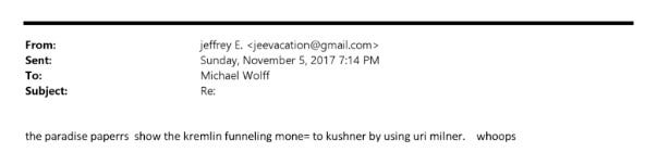 In a message to Michael Wolff, Jeffrey Epstein wrote, “The paradise papers show the Kremlin funneling money to Kushner by using Uri Milner. whoops,” a flippant remark suggesting alleged covert financial links possibly involving the Kremlin, Jared Kushner, and Yuri Milner.