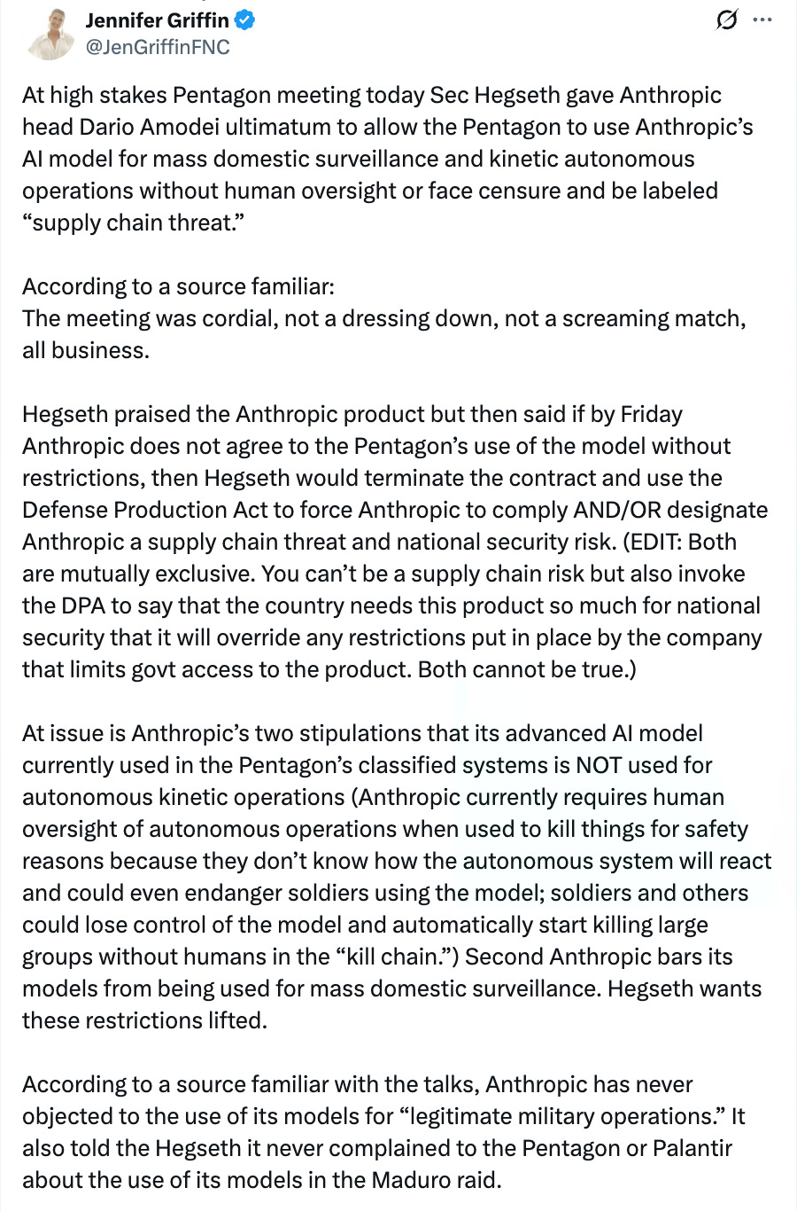 At a high-stakes meeting, Defense Secretary Pete Hegseth gave Anthropic CEO Dario Amodei a Friday deadline to drop the company’s AI guardrails — including restrictions on autonomous lethal systems and mass domestic surveillance — or potentially lose its roughly $200 million Pentagon contract, face being labeled a “supply-chain risk,” or be compelled under measures like the Defense Production Act to allow unrestricted military use of its Claude AI model, as the Pentagon pushes for broader access while Anthropic insists on maintaining ethical limits.