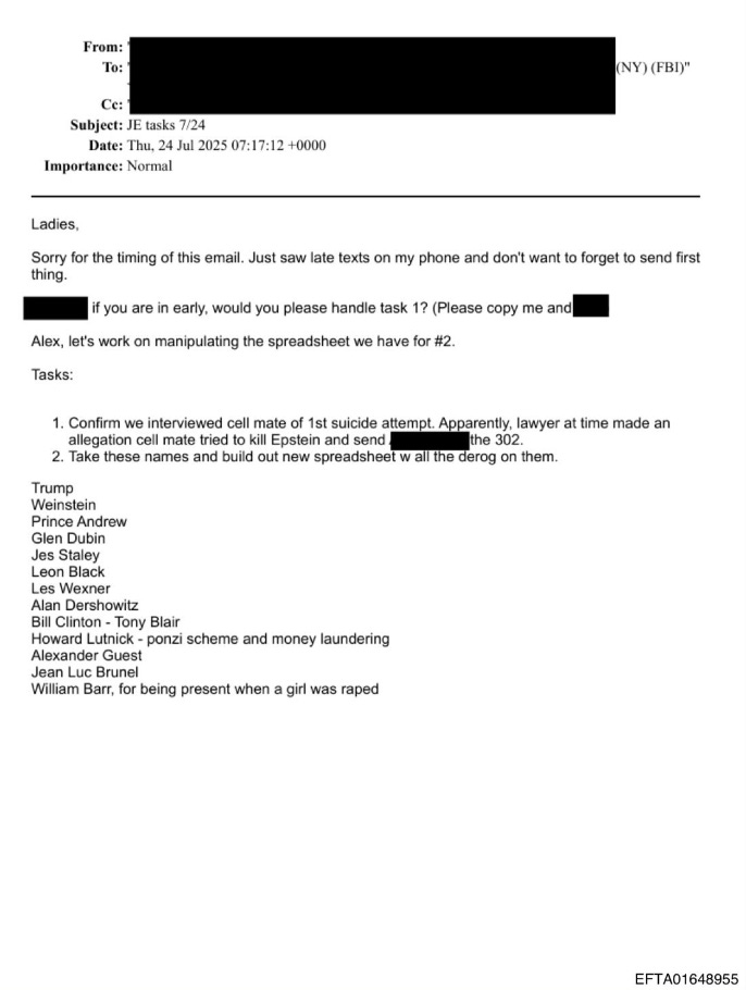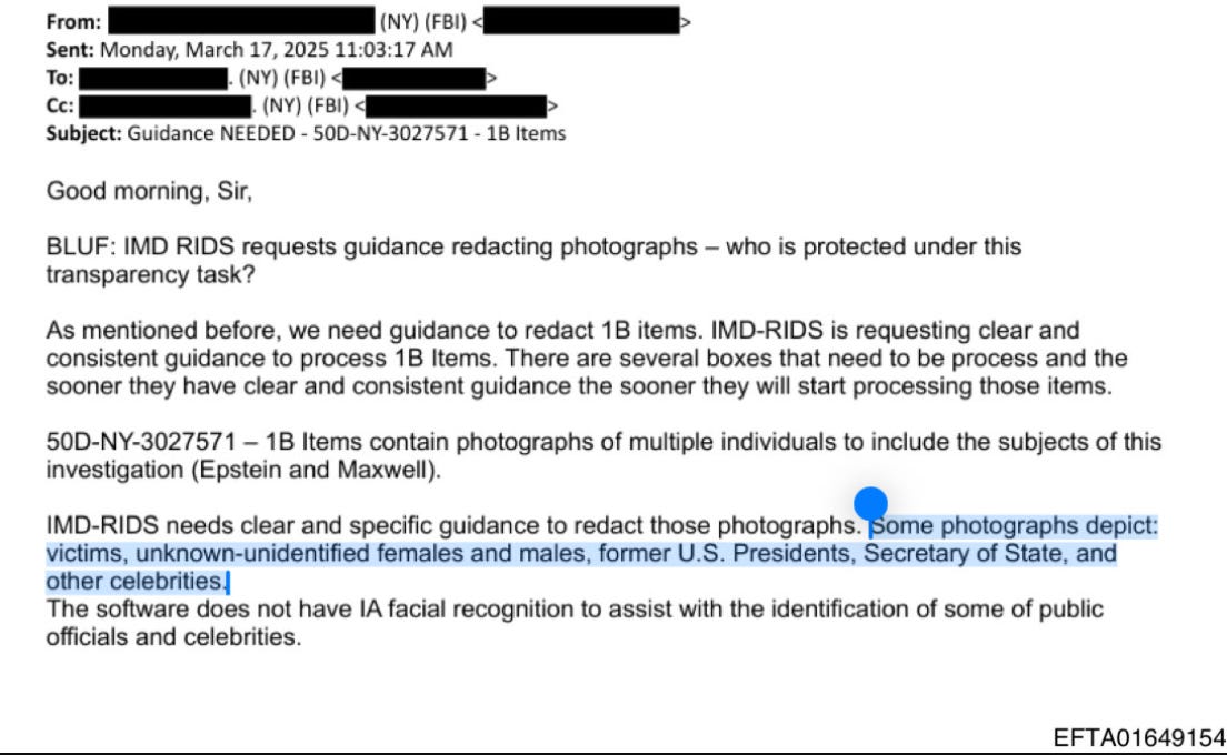 New files also raise concerns about federal handling of Epstein related evidence. In March 2025, the Federal Bureau of Investigation discussed internally whether they had “clear and specific guidance” to redact images involving former U.S. presidents, a secretary of state, and other celebrities.