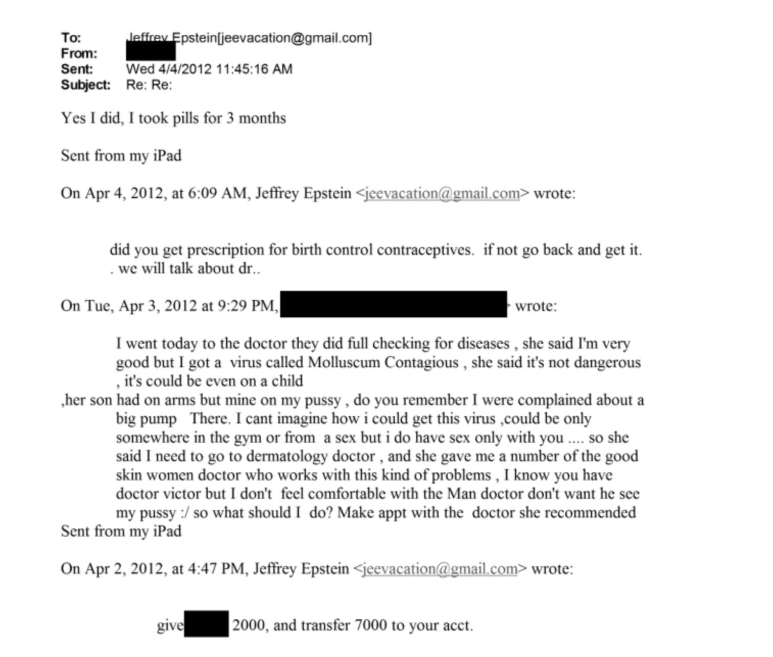 A newly revealed exchange shows Jeffrey Epstein communicating with a child he groomed and trafficked after she told him a doctor diagnosed her with molluscum, though her symptoms suggested a possible herpes infection. She said Epstein was the only person she had been sexually involved with and expressed confusion and distress about how she became ill, while also noting she was uncomfortable being examined by a male doctor associated with Epstein. The exchange highlights the coercion, loss of bodily autonomy, and power imbalance faced by Epstein’s victims, underscoring why survivor testimony is critical to understanding exploitation. Full email here.