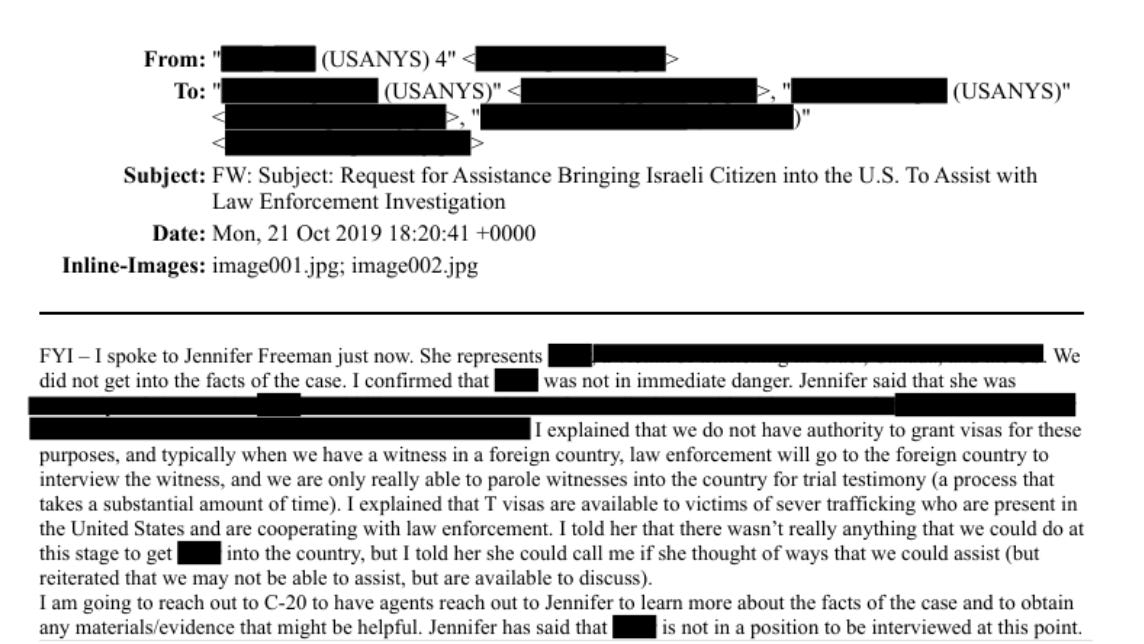 This email shows how there was a Epstein victim that was part of a sex-trafficking scheme in Israel, and how her attorney tried to get her to the United States of America. Read the full email chain here.