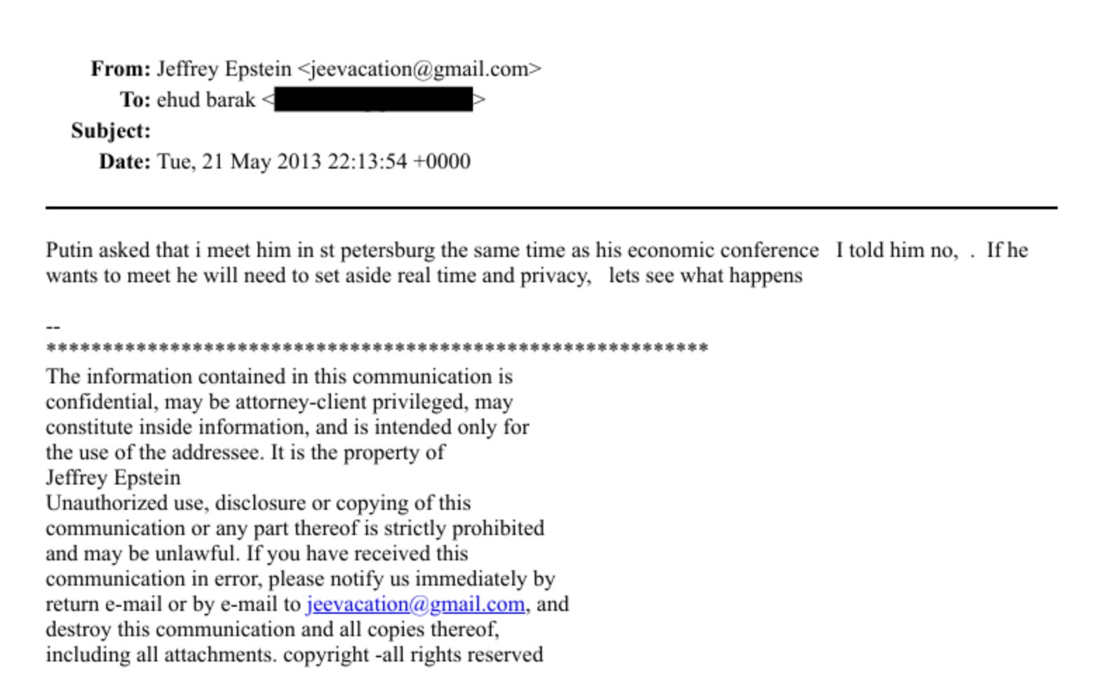 Separate emails show Epstein telling former Israeli prime minister Ehud Barak that he had been invited to the St. Petersburg International Economic Forum but declined, insisting that any meeting with Putin would require “real time and privacy.”