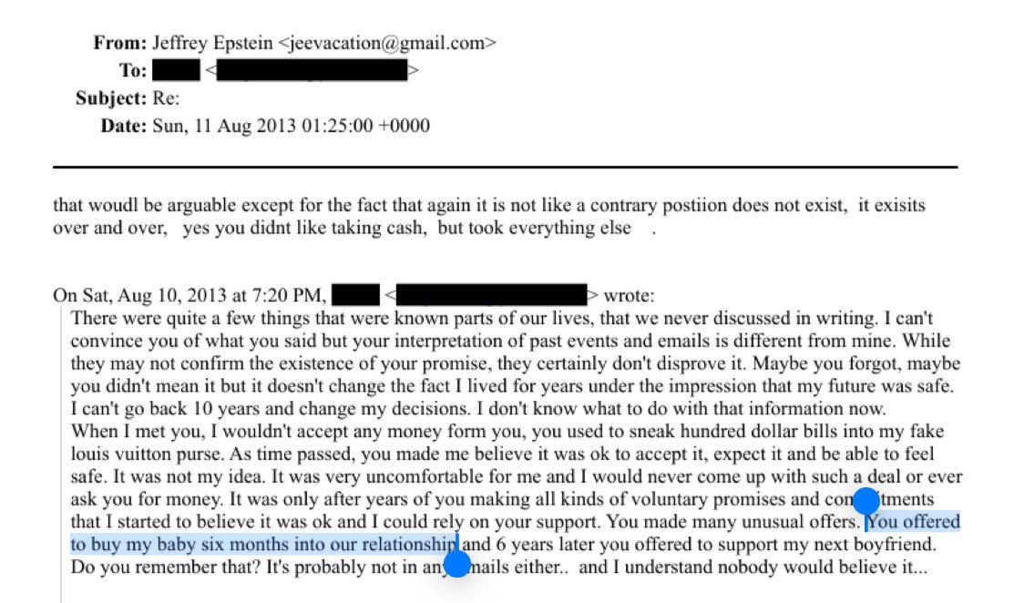 A 2013 email shows someone telling Jeffrey Epstein that he had offered to buy her baby, highlighting another disturbing and unexplained statement linked to his behavior.