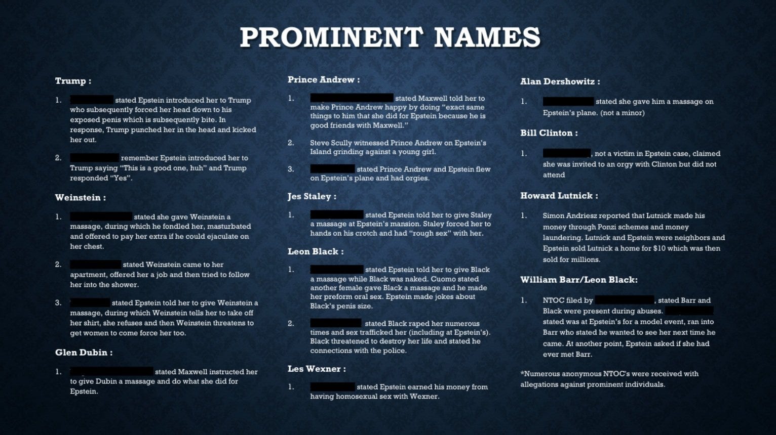 The names, included in a PowerPoint sent to FBI Director Kash Patel in 2025, range from Donald Trump and Bill Clinton to business and media figures, and contain accusations spanning rumors, sexual assault, orgies, and money laundering, many of which those named strongly deny.