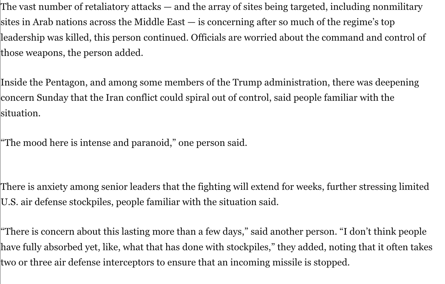 The Washington Post reports that the mood inside the Pentagon is described as intense and paranoid, with leaders concerned that the United States could deplete its air defense stockpiles and that the conflict may spiral out of control. Those fears echo warnings from Joint Chiefs Chair Gen. Dan Caine last week about the risks of escalation and mounting strain on military resources.