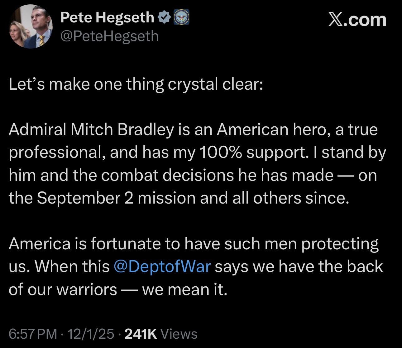 Late Monday night, Hegseth took to social media to proclaim his support for Admiral Bradley, saying he stands by the admiral’s “combat decisions” on the mission and throughout his career. But to many inside the Pentagon, the statement only reinforced their suspicion that Hegseth is trying to insulate himself from legal and political consequences while leaving Bradley exposed.