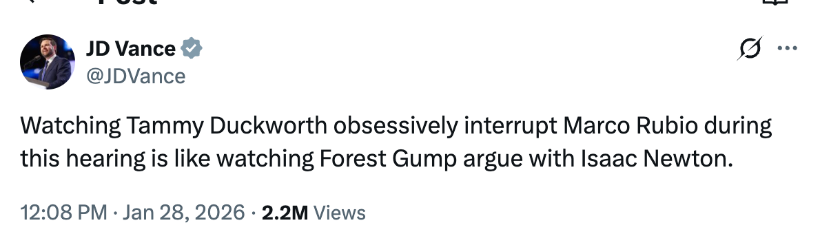 Vice President JD Vance is under significant fire for comparing Senator Tammy Duckworth to “Forrest Gump” today":